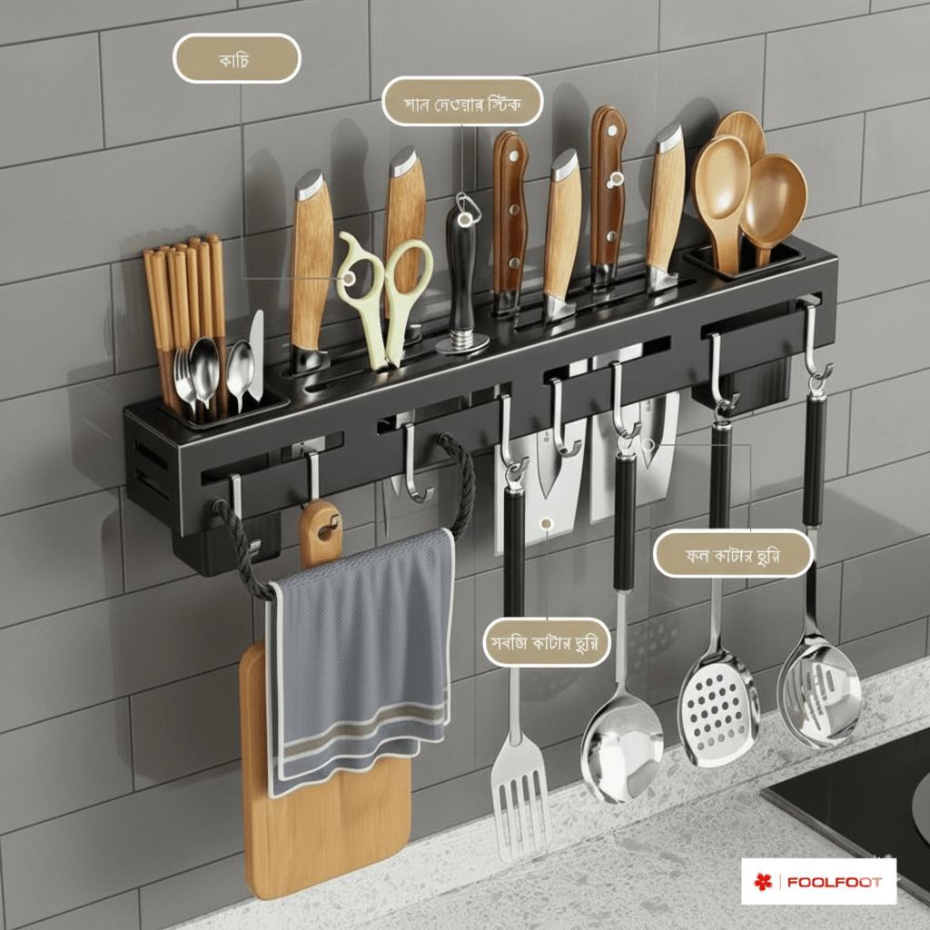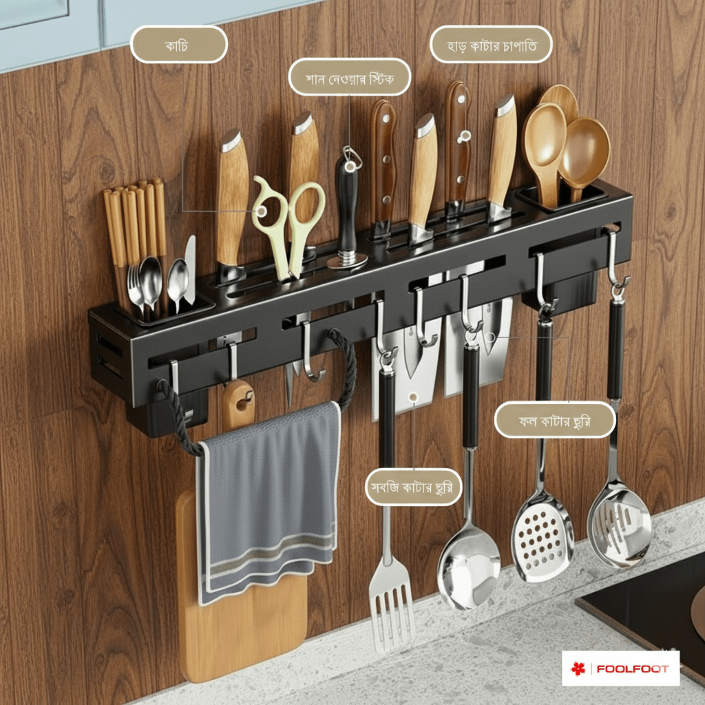 এই ম্যাগনেটিক নাইফ অর্গানাইজার ব্লকটি অত্যন্ত কার্যকর একটি স্টোরেজ সমাধান। এতে ছুরি, পিৎজা কাটার, পাই সার্ভার, ধাতব স্প্যাটুলা এবং অন্যান্য গুরুত্বপূর্ণ রান্নাঘরের সরঞ্জাম সংরক্ষণ করা যায়।