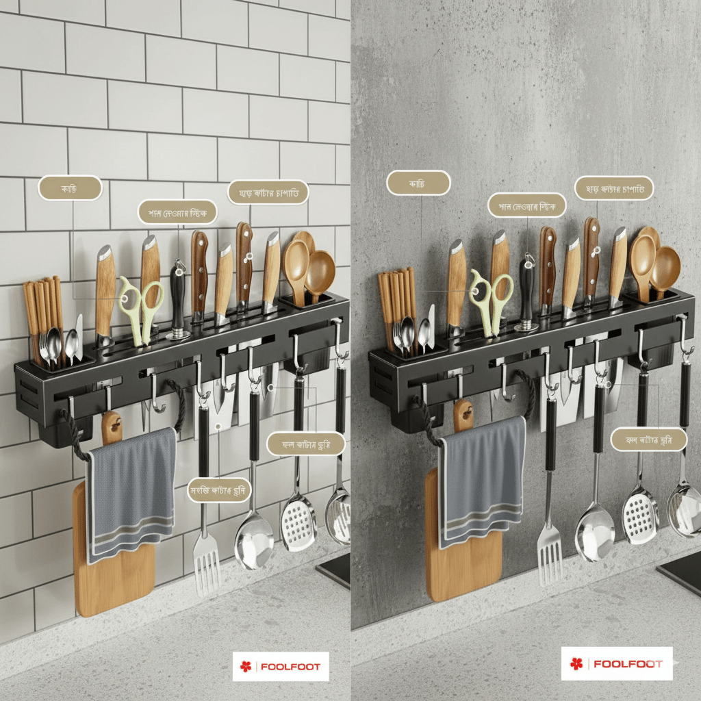 আধুনিক এই ওয়াল নাইফ এন্ড স্পুন হোল্ডারটি তৈরি করা হয়েছে উন্নতমানের স্যাটিন ফিনিশ স্টেইনলেস স্টিল দিয়ে, যা অত্যন্ত টেকসই এবং দীর্ঘদিন ধরে উজ্জ্বলতা বজায় রাখে। এটি সরাসরি পানি দিয়ে পরিষ্কার করা যায়, মরিচা পড়ে না, ক্ষয় হয় না বা রঙ ফিকে হয় না।